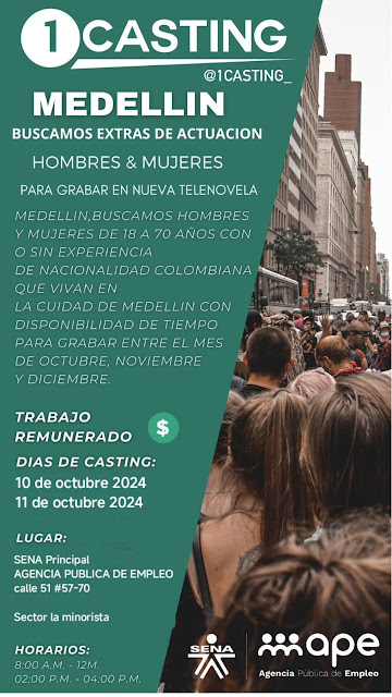 #SENAEsEmpleo | ¡Atención! Vacantes en Medellín (Ant.) y municipios cercanos. Postúlate a las de 200 vacantes disponibles de Extra de Actuación con y sin experiencia laboral. ¡Participa del Casting para grabar nueva Telenovela!